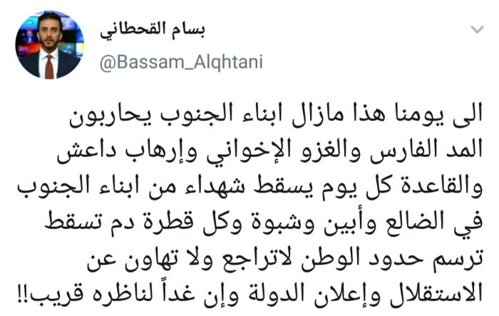 وكتب القحطاني، في تغريدة له عبر موقع التواصل الاجتماعي تويتر، تابعها المشهد العربي: "إلى يومنا هذا مازال أبناء الجنوب يحاربون المد الفارس والغزو الإخواني وإرهاب داعش والقاعدة".