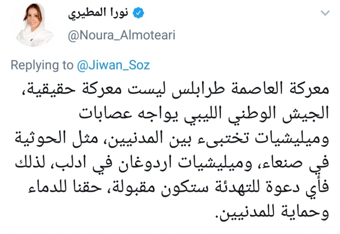 وكتبت المطيري، في تغريدة لها عبر موقع التواصل الاجتماعي تويتر، تابعها المشهد العربي: "معركة العاصمة طرابلس ليست معركة حقيقية، الجيش الوطني الليبي يواجه عصابات وميليشيات تختبىء بين المدنيين، مثل الحوثية في صنعاء، وميليشيات أردوغان في ادلب".