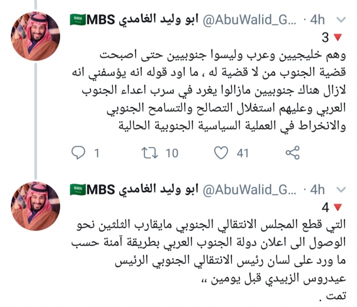 واستطرد: " ما أود قوله إنه يؤسفني أنه لازال هناك جنوبيين مازالوا يغرد في سرب أعداء الجنوب العربي وعليهم استغلال التصالح والتسامح الجنوبي والانخراط في العملية السياسية الجنوبية الحالية التي قطع المجلس الانتقالي الجنوبي مايقارب الثلثين نحو الوصول إلى إعلان دولة الجنوب العربي بطريقة آمنة حسب ما ورد على لسان رئيس الانتقالي الجنوبي الرئيس عيدروس الزبيدي قبل يومين".