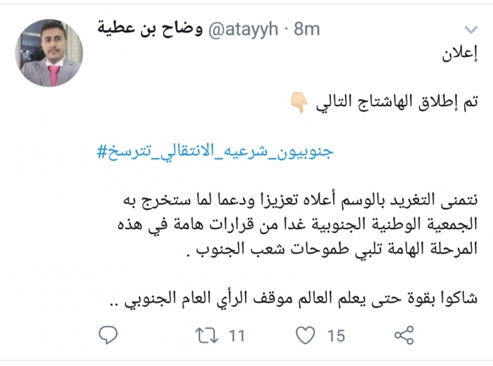 أعلن عضو الجمعية الوطنية الجنوبية وضاح بن عطية، إطلاق هاشتاج "جنوبيون شرعيه الانتقالي تترسخ".