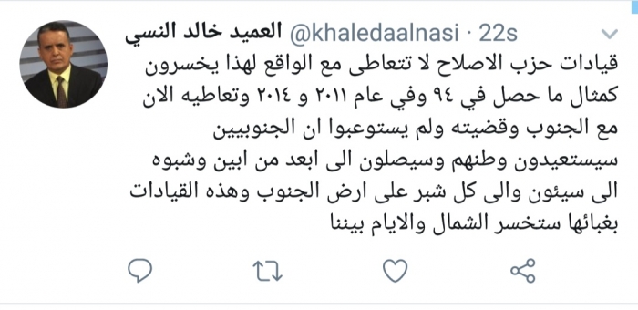 وكتب النسي، في تغريدة له عبر موقع التواصل الاجتماعي تويتر، تابعها المشهد العربي: "قيادات حزب الإصلاح لا تتعاطى مع الواقع لهذا يخسرون كمثال ما حصل في ٩٤ وفي عام ٢٠١١ و ٢٠١٤ تعاطيه الآن مع الجنوب وقضيته".
