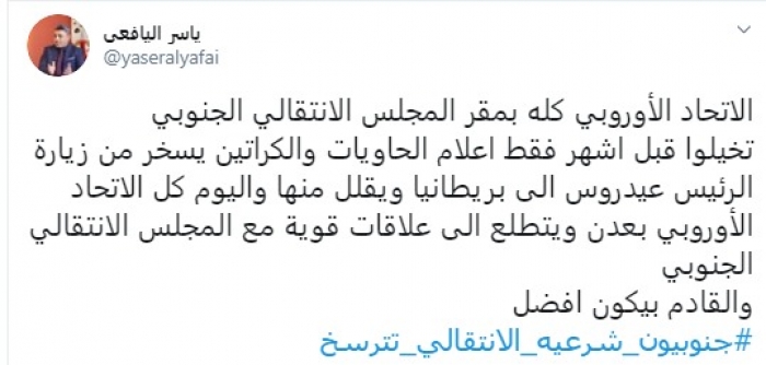 وكتب في تغريدة عبر "تويتر" رصدها "المشهد العربي": "الاتحاد الأوروبي كله بمقر المجلس الانتقالي الجنوبي تخيلوا قبل أشهر فقط إعلام الحاويات والكراتين يسخر من زيارة الرئيس عيدروس إلى بريطانيا ويقلل منها واليوم كل الاتحاد الأوروبي بعدن ويتطلع الى علاقات قوية مع المجلس الانتقالي الجنوبي والقادم بيكون أفضل".