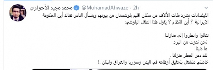 وقال في تغريدة عبر "تويتر" رصدها "المشهد العربي": "الفيضانات تشرد مئات الألاف من سكان اقليم بلوشستان من بيوتهم ويتسأل الناس هناك أين الحكومة الإيرانية ؟ أين النظام ؟ يقول هذا الطفل البلوشي: تعالوا وانظروا إلى منازلنا نحن نموت من البرد ما ذنبنا لقد دمر المطر منزلنا. خامنئي منشغل بتحقيق أوهامه في اليمن وسوريا والعراق ولبنان".