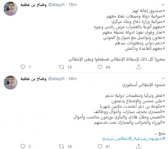 وقال في تغريدات عبر "تويتر" رصدها "المشهد العربي": "صمود الإنتقالي أسطوري.. قطر وتركيا وتنظيمات دولية تدعم.. علي محسن والإصلاح يدعمون.. حكومة بن دغر اعتمدت ملايين شهريًا.. الميسري يصرف سيارات وأموال ووظائف.. العيسي وجلال هادي والبكري يوزعون مناصب وأموال.. الوزراء والضرائب والجمارك تحت خدمتهم".