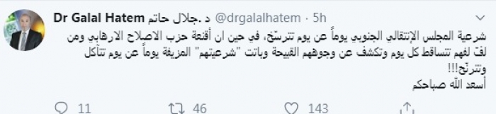 وقال في تغريدة عبر "تويتر" رصدها "المشهد العربي": "شرعية المجلس الإنتقالي الجنوبي يوماً عن يوم تترسّخ، في حين أن أقنعة حزب الإصلاح الارهابي ومن لفّ لفهم تتساقط كل يوم وتكشف عن وجوههم القبيحة وباتت شرعيتهم المزيفة يوماً عن يوم تتآكل وتترنّح أسعد الله صباحكم".
