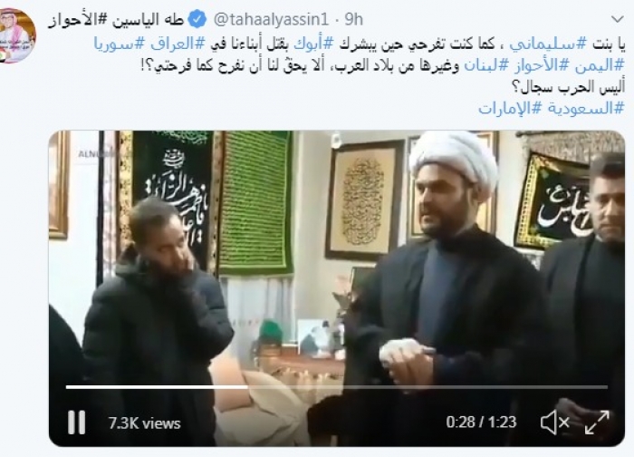 وقال في تغريدة عبر "تويتر" رصدها "المشهد العربي": "يا بنت سليماني ، كما كنت تفرحي حين يبشرك بوك بقتل أبناءنا في العراق سوريا اليمن الأحواز لبنان وغيرها من بلاد العرب، ألا يحقُ لنا أن نفرح كما فرحتي؟! أليس الحرب سجال؟".