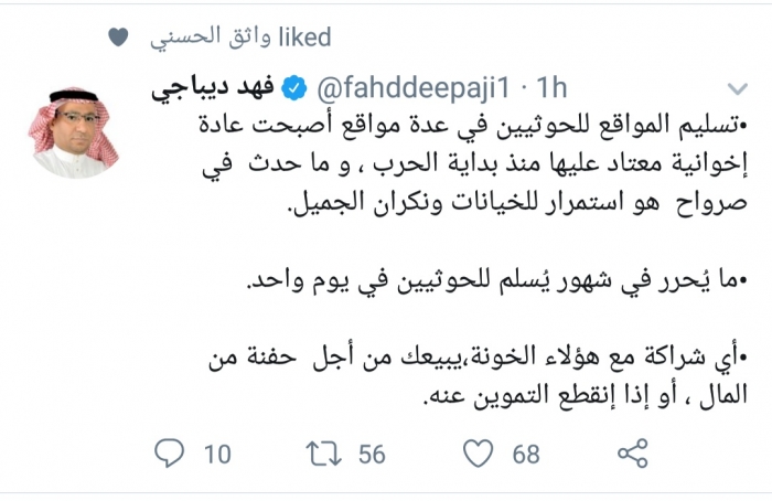 وكتب ديباجي، في تغريدة له على موقع التواصل الاجتماعي تويتر، تابعها المشهد العربي: "تسليم المواقع للحوثيين في عدة مواقع أصبحت عادة إخوانية معتاد عليها منذ بداية الحرب".