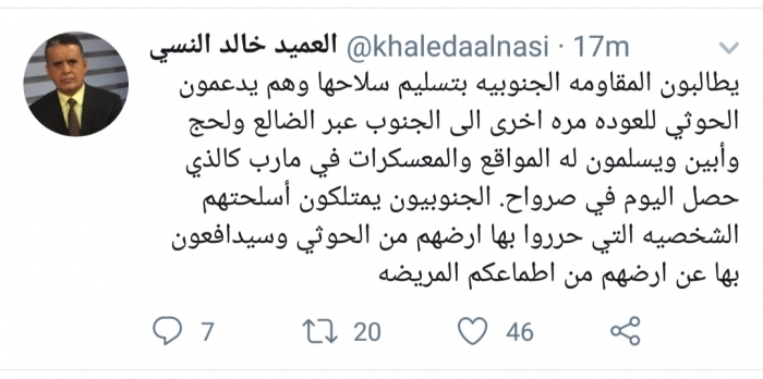 وكتب النسي، في تغريدة له على موقع التواصل الاجتماعي تويتر، تابعها المشهد العربي: "يطالبون المقاومة الجنوبية بتسليم سلاحها وهم يدعمون الحوثي للعودة مرة أخرى إلى الجنوب عبر الضالع ولحج وأبين ويسلمون له المواقع والمعسكرات في مأرب كالذي حصل اليوم في صرواح".