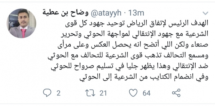 وتابع: "لكن اللي أتضح أنه يحصل العكس وعلى مرأى ومسمع التحالف تذهب قوى الشرعية للتحالف مع الحوثي ضد الانتقالي وهذا يظهر جليا في تسليم صرواح للحوثي وفي انضمام الكتايب من الشرعية إلى الحوثي".