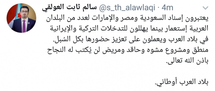 وكتب العولقي، في تغريدة له عبر موقع التواصل الاجتماعي تويتر، تابعها المشهد العربي: "يعتبرون إسناد السعودية ومصر والإمارات لعدد من البلدان العربية استعمار بينما يهللون للتدخلات التركية والإيرانية في بلاد العرب ويعملون على تعزيز حضورها بكل السُبل".