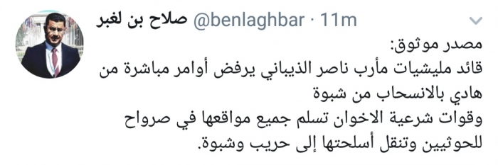 ونقل بن لغبر، في تغريدة له عبر موقع التواصل الاجتماعي تويتر، تابعها المشهد العربي، عن مصدر موثوق، قوله إن "قائد مليشيات مأرب ناصر الذيباني يرفض أوامر مباشرة من هادي بالانسحاب من شبوة".