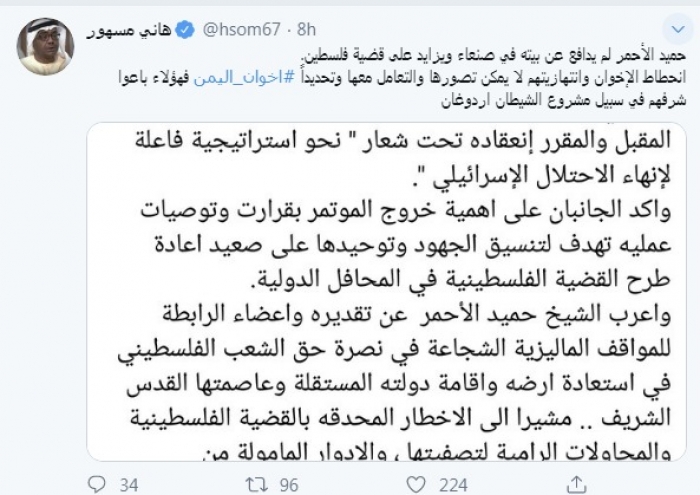 وقال في تغريدة عبر "تويتر" رصدها "المشهد العربي": "حميد الأحمر لم يدافع عن بيته في صنعاء ويزايد على قضية فلسطين".