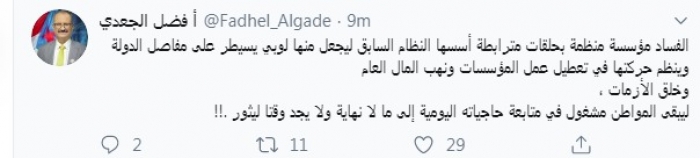 وكتب في تغريدة عبر "تويتر" رصدها "المشهد العربي": "الفساد مؤسسة منظمة بحلقات مترابطة أسسها النظام السابق ليجعل منها لوبي يسيطر على مفاصل الدولة وينظم حركتها في تعطيل عمل المؤسسات ونهب المال العام وخلق الأزمات، ليبقى المواطن مشغول في متابعة حاجياته اليومية إلى ما لا نهاية ولا يجد وقتا ليثور".