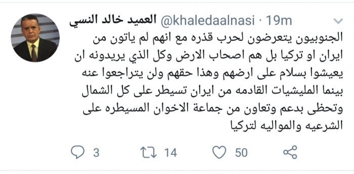 وكتب النسي، في تغريدة له عبر موقع التواصل الاجتماعي تويتر، تابعها المشهد العربي: "الجنوبيون يتعرضون لحرب قذرة مع أنهم لم يأتوا من إيران أو تركيا بل هم أصحاب الأرض".
