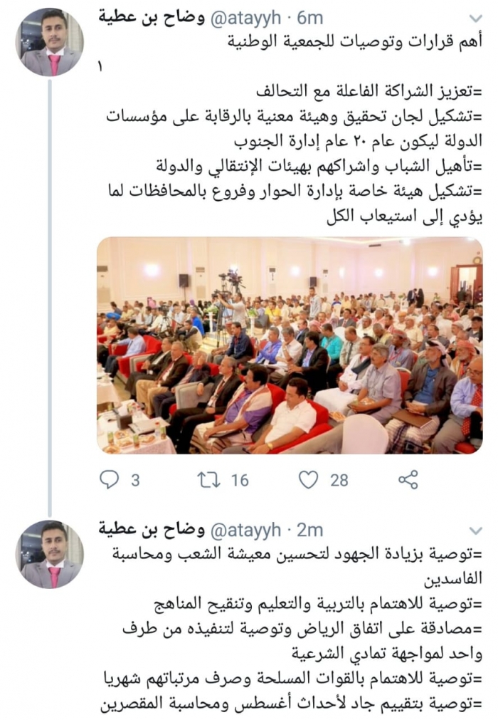 فند عضو الجمعية الوطنية الجنوبية، وضاح بن عطية، أهم قرارات وتوصيات للجمعية الوطنية.