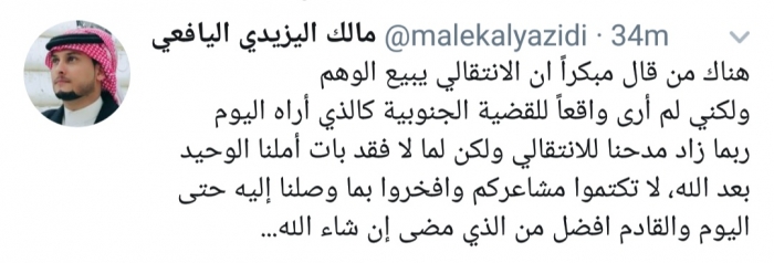 وكتب اليافعي، في تغريدة له على موقع التواصل الاجتماعي تويتر، تابعها المشهد العربي: "هناك من قال مبكراً إن الانتقالي يبيع الوهم، ولكني لم أرى واقعاً للقضية الجنوبية كالذي أراه اليوم".