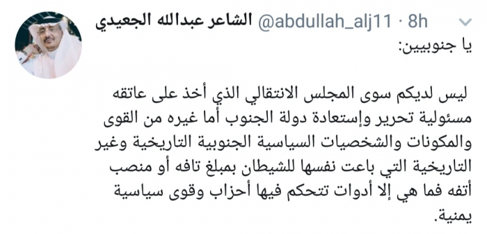 وجه الشاعر عبدالله الجعيدي، رسالة هامة إلى أبناء الجنوب العربي.