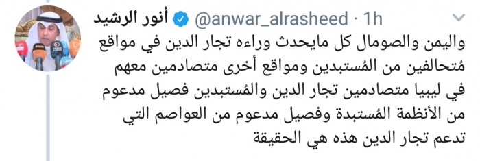 أكد الكاتب الكويتي أنور الرشيد، أن ما تعاني منه اليمن وراءه تجار الدين المتحالفين مع الحكومة.