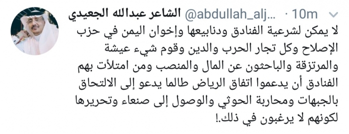 وكتب الجعيدي، في تغريدة له عبر موقع التواصل الاجتماعي تويتر، تابعها المشهد العربي: "لا يمكن لشرعية الفنادق ودنابيعها وإخوان اليمن في حزب الإصلاح وكل تجار الحرب والدين وقوم شيء عيشة والمرتزقة والباحثون عن المال والمنصب ومن امتلأت بهم الفنادق أن يدعموا اتفاق الرياض طالما يدعو إلى الالتحاق بالجبهات ومحاربة الحوثي والوصول إلى صنعاء وتحريرها لكونهم لا يرغبون في ذلك".