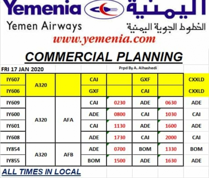 ينشر المشهد العربي جدول رحلات طيران اليمنية، المقررة غدا الجمعة، حيث تتوزع على القاهرة ومومباي.