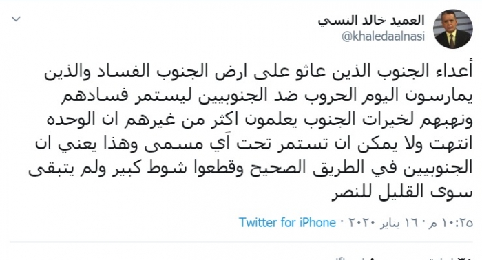 وقال "النسي"، في تغريدة نشرها عبر حسابه بـ"تويتر"، رصدها المشهد العربي: "أعداء الجنوب الذين عاثو على أرض الجنوب الفساد والذين يمارسون اليوم الحروب ضد الجنوبيين ليستمر فسادهم ونهبهم لخيرات الجنوب يعلمون أكثر من غيرهم أن الوحدة انتهت ولا يمكن أن تستمر تحت أي مسمى".