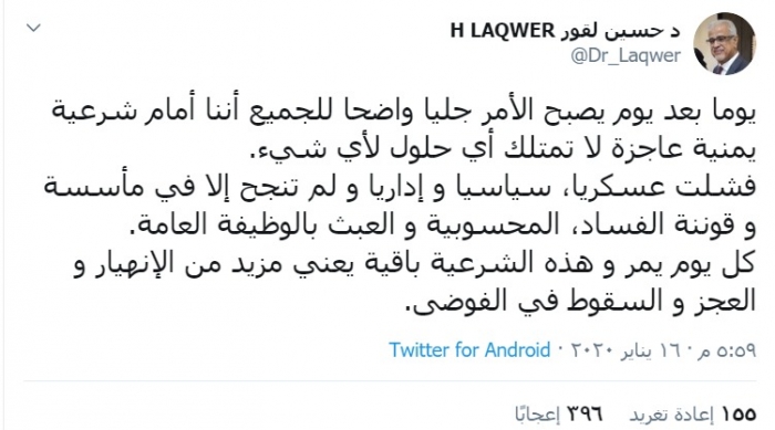 وقال "لقور" في تغريدة نشرها عبر حسابه الشخصي بـ"تويتر"، رصدها المشهد العربي: "يوماً بعد يوم يصبح الأمر جلياً واضحاً للجميع أننا أمام شرعية يمنية عاجزة لا تمتلك أي حلول لأي شيء".