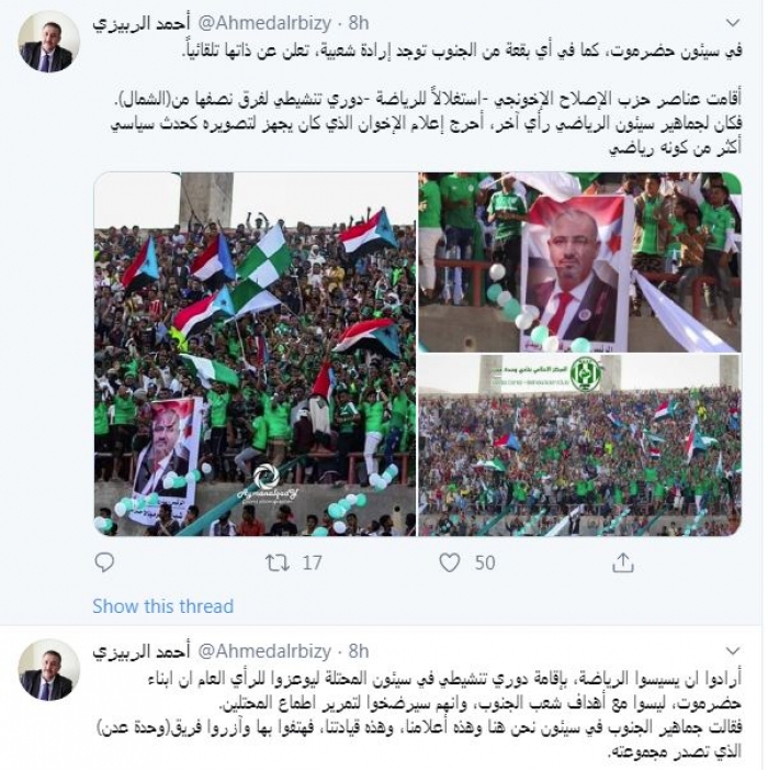 وأضاف في تغريدة أخرى: "في سيئون حضرموت، كما في أي بقعة من الجنوب توجد إرادة شعبية، تعلن عن ذاتها تلقائياً. أقامت عناصر حزب الإصلاح الإخونجي -استغلالاً للرياضة -دوري تنشيطي لفرق نصفها من(الشمال). فكان لجماهير سيئون الرياضي رأي آخر، أحرج إعلام الإخوان الذي كان يجهز لتصويره كحدث سياسي أكثر من كونه رياضي".