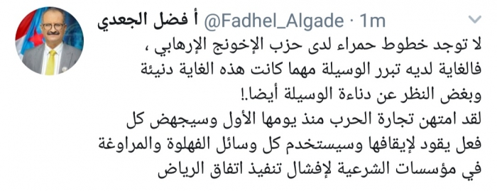 وكتب الجعدي، في تغريدة له عبر موقع التواصل الاجتماعي تويتر، تابعها المشهد العربي: "لا توجد خطوط حمراء لدى حزب الإخونج الإرهابي، فالغاية لديه تبرر الوسيلة مهما كانت هذه الغاية دنيئة وبغض النظر عن دناءة الوسيلة أيضا".
