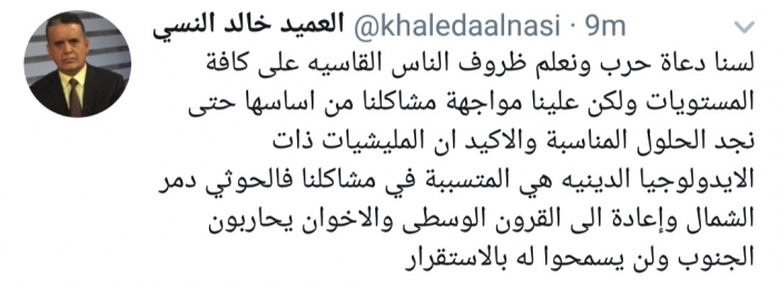 وكتب النسي، في تغريدة له عبر موقع التواصل الاجتماعي تويتر، تابعها المشهد العربي: "لسنا دعاة حرب ونعلم ظروف الناس القاسية على كافة المستويات ولكن علينا مواجهة مشاكلنا من أساسها حتى نجد الحلول المناسبة".