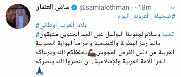 وكتب العثمان، في تغريدة له عبر موقع التواصل الاجتماعي تويتر، تابعها المشهد العربي: "تحية وسلام لجنودنا البواسل على الحد الجنوبي ستبقون دائماً رمز البطولة والتضحية وحراساً البوابة الجنوبية العربية من دنس الفرس المجوس، يحفظكم الله ويرعاكم ذخرا للامة العربية والإسلامية، أن تنصروا الله ينصركم".