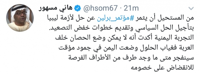 وكتب مسهور، في تغريدة له عبر موقع التواصل الاجتماعي تويتر، تابعها المشهد العربي: "من المستحيل أن يثمر مؤتمر برلين عن حل لأزمة ليبيا بتأجيل الحل السياسي وتقديم خطوات خفض التصعيد".