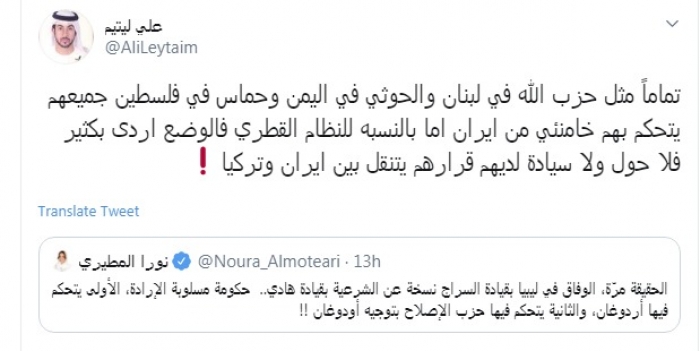 جاء ذلك في مجمل رده على تغريدة للكاتبة والباحثة نورا المطيري قالت فيها: "الحقيقة مرّة، الوفاق في ليبيا بقيادة السراج نسخة عن الشرعية بقيادة هادي.. حكومة مسلوبة الإرادة، الأولى يتحكم فيها أردوغان، والثانية يتحكم فيها حزب الإصلاح بتوجيه أردوغان".