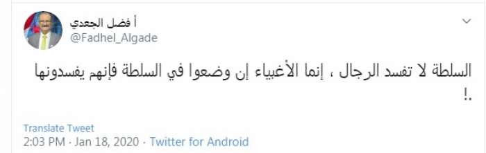 وكتب في تغريدة عبر "تويتر" رصدها "المشهد العربي": "السلطة لا تفسد الرجال، إنما الأغبياء إن وضعوا في السلطة فإنهم يفسدونها".