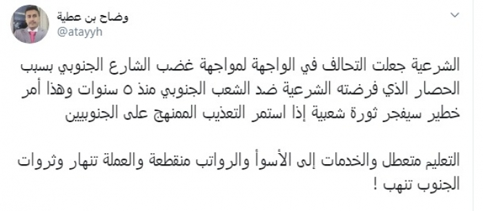 وقال في تغريدة على حسابه الشخصي في موقع التواصل الاجتماعي، تويتر، إن: "الشرعية جعلت التحالف في الواجهة لمواجهة غضب الشارع الجنوبي بسبب الحصار الذي فرضته الشرعية ضد الشعب الجنوبي منذ ٥ سنوات".