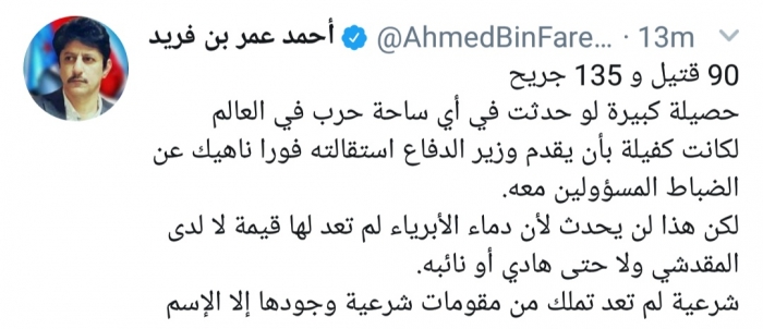 وكتب بن فريد، في تغريدة له عبر موقع التواصل الاجتماعي تويتر، تابعها المشهد العربي: "90 قتيل و135 جريح، حصيلة كبيرة لو حدثت في أي ساحة حرب في العالم لكانت كفيلة بأن يقدم وزير الدفاع استقالته فورا ناهيك عن الضباط المسؤولين معه".