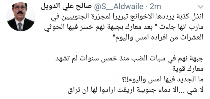 واستنكر ما اعتبره "تبريرات تنظيم الإخوان لمجزرة الجنوبيين في مارب، أنها جاءت بعد معارك بجبهة نهم خسر فيها الحوثي العشرات من أفراده أمس واليوم".