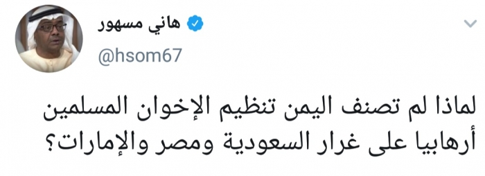 وكتب مسهور، في تغريدة له عبر موقع التواصل الاجتماعي تويتر، تابعها المشهد العربي: "لماذا لم تصنف اليمن تنظيم الإخوان المسلمين إرهابيا على غرار السعودية ومصر والإمارات؟".