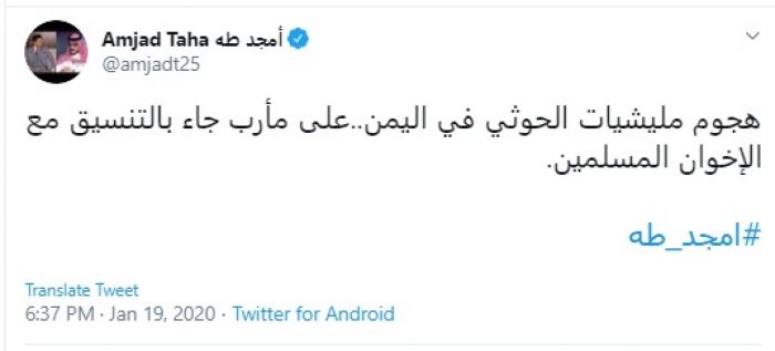 وكتب في تغريدة عبر "تويتر" رصدها "المشهد العربي": "هجوم مليشيات الحوثي في اليمن..على مأرب جاء بالتنسيق مع الإخوان المسلمين".