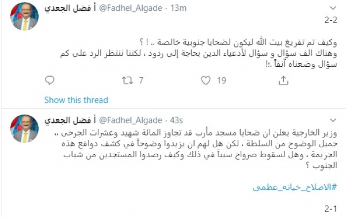 وأضاف: "وكيف تم تفريغ بيت الله ليكون لضحايا جنوبية خالصة..!؟ وهناك الف سؤال و سؤال لأدعياء الدين بحاجة إلى ردود، لكننا ننتظر الرد على كم سؤال وضعناه آنفاً".