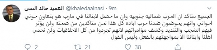 وقال في تغريدة عبر "تويتر" رصدها "المشهد العربي": "الجميع متأكد أن الحرب شمالية جنوبية وأن ما حصل لأبنائنا في مأرب هو بتعاون حوثي إخواني وإنهم يخوضون ضدنا حرب إبادة كل هذا نحن متأكدين من صحته ولن يؤثر فيهم الشجب والتنديد وكشف مؤامراتهم لأنهم تجردوا من كل الأخلاقيات ولن نحمي أهلنا وأبنائنا إلا بمواجهتهم بالفعل وليس القول".