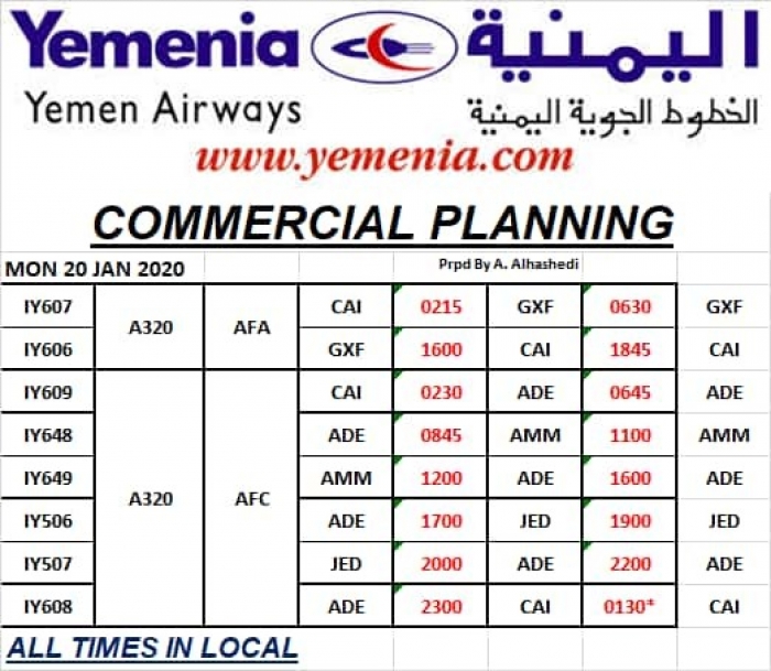 ينشر "المشهد العربي" جدول رحلات طيران اليمنية المقررة الإثنين، والتي تتوزع على عدة وجهات.