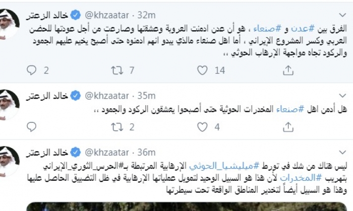 وأوضح: "الفرق بين عدن وصنعاء، هو أن عدن أدمنت العروبة وعشقتها وصارعت من أجل عودتها للحضن العربي وكسر المشروع الإيراني، أما أهل صنعاء الذي يبدو أنهم أدمنوه حتى أصبح يخيم عليهم الجمود والركود تجاه مواجهة الإرهاب الحوثي".