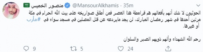 وقال في تغريدة عبر "تويتر" رصدها "المشهد العربي": "الحوثيون لا شك أنهم بأفعالهم هم قرامطة هذا العصر فمن أطلق صواريخه على بيت الله الحرام في مكة مرتين أحدها في شهر رمضان المبارك، لن يجد ما يردعه عن قتل المصليين في مسجد سواء في مأرب أو غيرها. رحم الله الشهداء وألهم ذويهم الصبر والسلوان".
