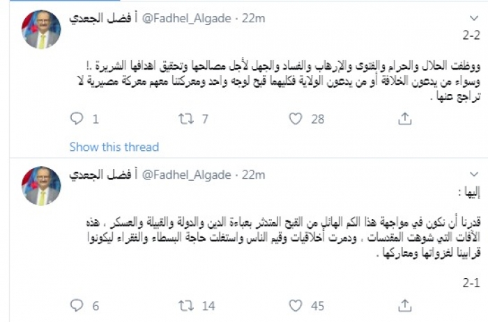 قال عضو هيئة رئاسة المجلس الانتقالي الجنوبي فضل الجعدي، اليوم، إن المعركة مستمرة ضد مليشيات الإخوان التابعة للشرعية والتي تتستر بعباءة الدين وتوظيفه لأجل مصالحها.
