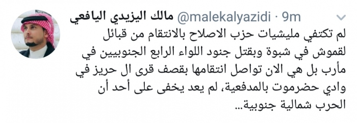 وكتب اليافعي، في تغريدة له عبر موقع التواصل الاجتماعي تويتر، تابعها المشهد العربي: "لم تكتفِ مليشيات حزب الإصلاح بالانتقام من قبائل لقموش في شبوة وبقتل جنود اللواء الرابع الجنوبيين في مأرب بل هي الآن تواصل انتقامها بقصف قرى آل حريز في وادي حضرموت بالمدفعية".