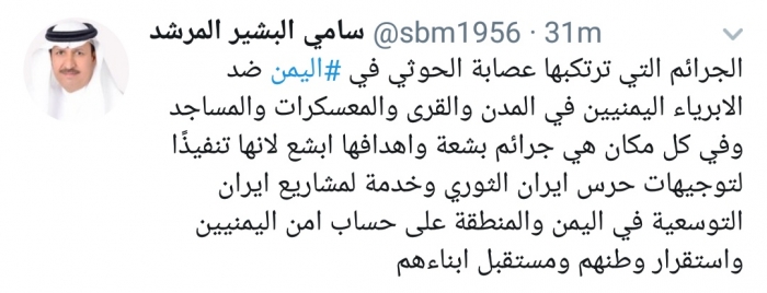وكتب المرشد، في تغريدة له عبر موقع التواصل الاجتماعي تويتر، تابعها المشهد العربي: "الجرائم التي ترتكبها عصابة الحوثي في اليمن ضد الأبرياء اليمنيين في المدن والقرى والمعسكرات والمساجد وفي كل مكان هي جرائم بشعة وأهدافها أبشع لأنها تنفيذًا لتوجيهات حرس إيران الثوري وخدمة لمشاريع إيران التوسعية في اليمن والمنطقة على حساب أمن اليمنيين واستقرار وطنهم ومستقبل أبناءهم".