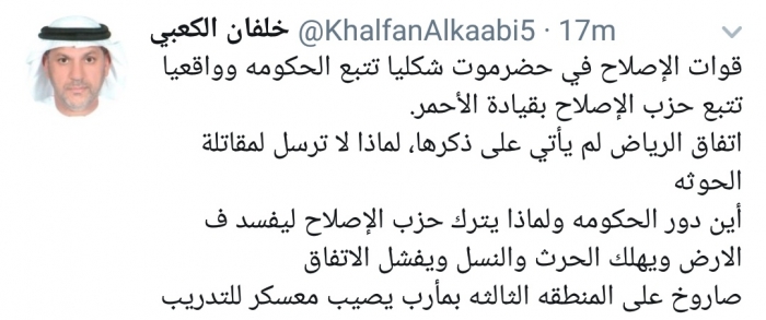 وكتب الكعبي، في تغريدة له عبر موقع التواصل الاجتماعي تويتر، تابعها المشهد العربي: "قوات الإصلاح في حضرموت شكليا تتبع الحكومة وواقعيا تتبع حزب الإصلاح بقيادة الأحمر".