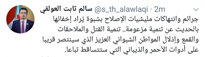 وكتب العولقي، في تغريدة له عبر موقع التواصل الاجتماعي تويتر، تابعها المشهد العربي: "جرائم وانتهاكات مليشيات الإصلاح بشبوة يُراد إخفائها بالحديث عن تنمية مزعومة".