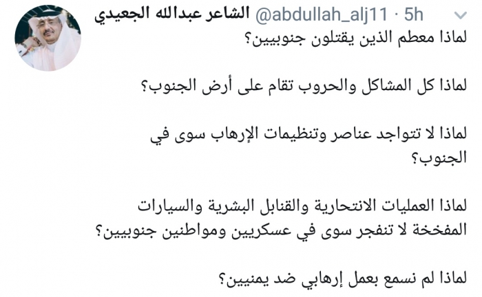 وكتب الجعيدي، في تغريدة له عبر موقع التواصل الاجتماعي تويتر، تابعها المشهد العربي: "لماذا معظم الذين يقتلون جنوبيين؟، لماذا كل المشاكل والحروب تقام على أرض الجنوب؟".
