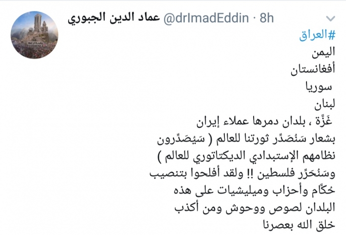 وكتب الجبوري، في تغريدة له على موقع التواصل الاجتماعي تويتر، تابعها المشهد العربي: "العراق.. اليمن.. أفغانستان.. سوريا.. لبنان.. غَزَّة، بلدان دمرها عملاء إيران بشعار سَنُصَدِّر ثورتنا للعالم، (سَيُصَدِّرون نظامهم الإستبدادي الديكتاتوري للعالم) وسَنُحَرِّر فلسطين".